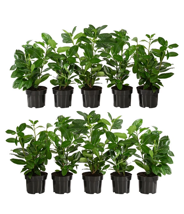 Gerade sind Sie ins Haus eingezogen und jetzt wird die Gartenplanung in Angriff genommen. Aber was brauchen Sie vor Blumenrabatten und blühenden Sträuchern? Richtig, eine Hecke, die schnell neugierige Blicke abhält und aus dem Garten Ihr ganz privates grünes Paradies macht. Wenn Ihre Hecke dabei ganzjährig grün und blickdicht sein soll, ist Kirschlorbeer eine ausgezeichnete Wahl. Die Heckenpflanze trägt nicht nur ein kräftiges, lorbeerähnliches Blattkleid, sondern schmückt sich im Mai und Juni auch mit duftenden, weißen Blütenrispen, aus denen sich im Herbst kirschgroße, schwarze Früchte entwickeln, die vielen Wildvögeln als Nahrung dient. Was aber seine Beliebtheit perfekt macht: Der schnellwachsende Strauch braucht nicht viel Aufmerksamkeit und wächst fast von allein. Wenn Sie also schnell eine dichte, immergrüne Hecke ums Grundstück möchten, wählen Sie den Kirschlorbeer, den wir Ihnen hier im Paket von 10 Pflanzen für 2-3 Meter Hecke anbieten.