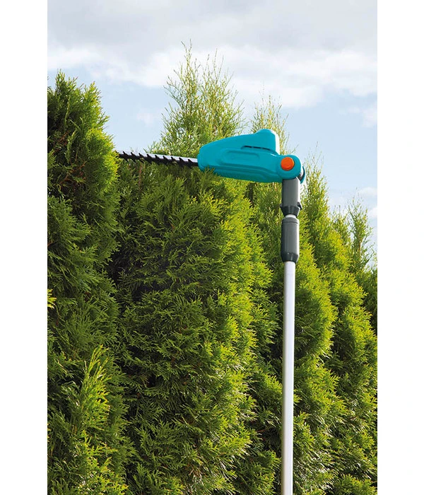 Haben Sie auf Ihrem Grundstück eine hohe Hecke, die zurückgeschnitten werden muss, und möchten Sie sich dabei die Arbeit erleichtern? Dann ist die Akku-Teleskop-Heckenschere THS 42/18V P4A aus dem Hause GARDENA ideal für Sie geeignet. Die Akku-Schere lässt sich nicht nur durch ihre Teleskopstange kinderleicht in der Länge verstellen, sodass Sie bequem vom Boden aus Thuja, Kirschlorbeer und Co in Form bringen können. Aufgrund ihres abwinkelbaren Schneidekopfs ermöglicht Sie Ihnen zudem auch den leichten Schnitt des Heckendachs, ohne eine Leiter benutzen zu müssen. Darüber hinaus sorgt die optimale Messer-Ergonomie der GARDENA Schere stets für saubere Ergebnisse ohne ausgefranste Stellen.