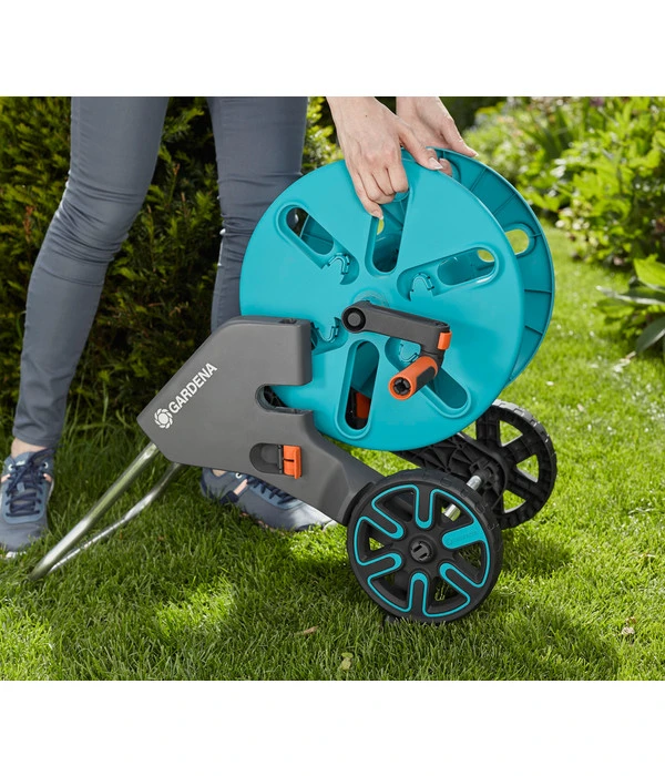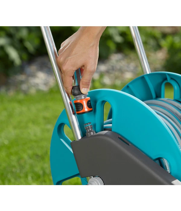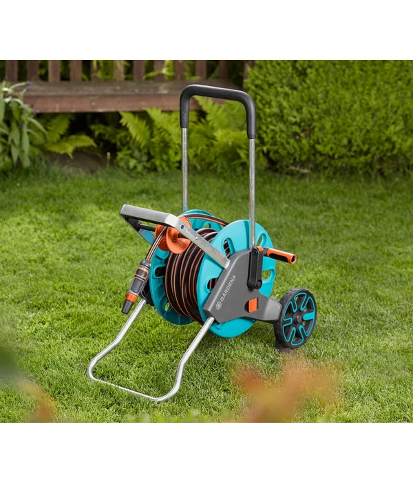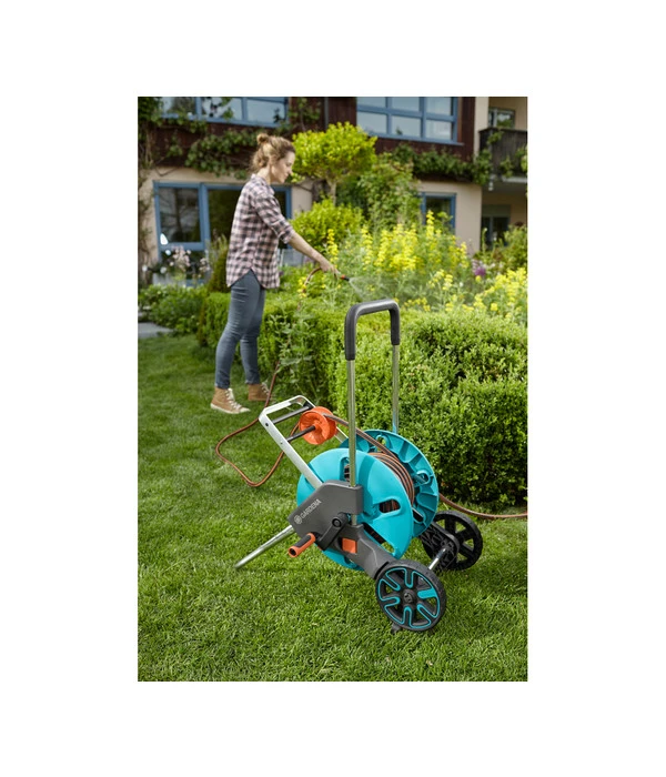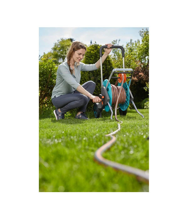 Dank dem Kick&Stand-System, sprich dem ausklappbaren Standfuß mit spezieller Form, bietet der Wagen mit praktischer Schlauchführung und höhenverstellbarem Griff einen prima Stand. Zudem sorgt der abgewinkelte Schlauchanschluss im Trommelinnern dafür, dass der Schlauch nicht geknickt wird, was sich natürlich positiv auf den Wasserdurchfluss auswirkt. Zum Set gehören ein 20 Meter langer Comfort FLEX Schlauch mit 13 Millimetern Durchmesser, original GARDENA Systemteile sowie eine Spritze – damit ist es sofort einsatzbereit. Es darf also jederzeit losgehen. Zudem ist eine Umrüstung auf das GARDENA Profi-System möglich.