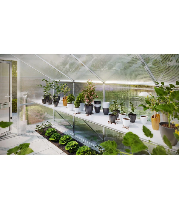 In einem Gewächshaus gibt es immer etwas zu tun. Für Arbeiten, zu denen man Werkzeug, Gefäße, Erde und mehr benötigt, brauchen Sie vor allem eines: Platz. Und den schaffen Sie auf einfache Weise mit einem KGT Gewächshaustisch. Denn wer ein KGT Gewächshaus besitzt, ist in der glücklichen Lage, aus einem herausragenden Angebot an durchdachtem Zubehör auswählen zu können. Und durchdacht heißt in diesem Fall immer, dass nicht nur das Produkt an sich hochwertig ist, sondern seine Funktionalität genau auf die Arbeitsprozesse in einem Gewächshaus zugeschnitten ist. Selbstverständlich wurde der Gewächshaustisch mit einem stabilen Aluminiumrahmen ausgestattet. Die praktischen Kunststoffplatten der Tischfläche sind robust, widerstandsfähig und sehen dennoch gut aus. Die Länge wählen Sie genau passend zu Ihrem Gewächshaus. In der Tiefe bietet der praktische Tisch auf 63,5 cm großzügig Platz. Mit einer Arbeitshöhe von 80 cm können Sie bequem im Stehen arbeiten. Die Montage ist einfach, da alle Teile perfekt auf das Gewächshaussystem abgestimmt sind.