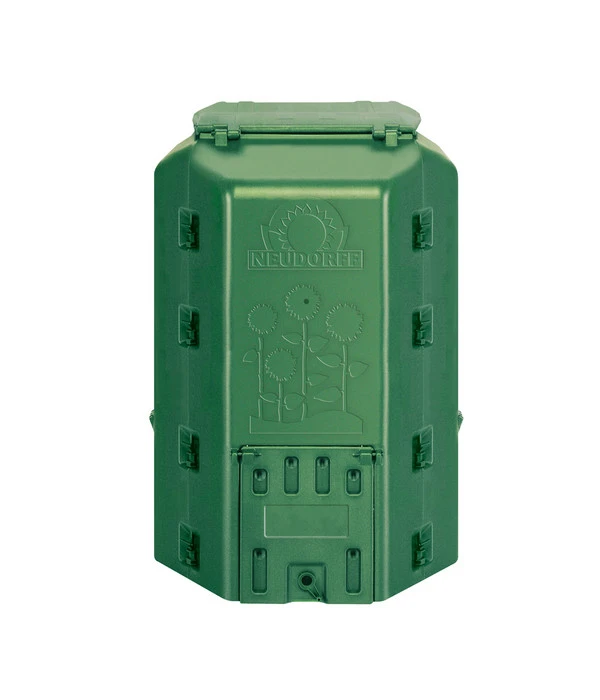 Jeder Hobby-Gärtner weiß, dass es für die Pflanzen im Garten nichts Besseres gibt als guten, reifen Kompost. Mit dem Neudorff Thermokomposter DuoTherm kommen Sie jetzt viel schneller an das ‚Schwarze Gold des Gärtners‘ als bei einem herkömmlichen Komposthaufen. Der Neudorff Thermokomposter DuoTherm ist aus robustem, wetterfestem Recycling-Kunststoff gefertigt. Durch die doppelwandige Konstruktion hat er eine hervorragende Wärmedämmung, die zwischen den Wänden eingeschlossene Luft dient ebenfalls als Isolierschicht. Der Deckel ist zweiteilig und ebenfalls doppelwandig isoliert. Die Kompostentnahme erfolgt durch die zwei Entnahmeklappen am Boden. Alternativ können auch die Seitenteile mit wenigen Handgriffen abgenommen werden. Mit seinem Volumen von 530 Liter ist der Neudorff Thermokomposter DuoTherm ideal für kleinere Gärten oder wenn nur Küchenabfälle kompostiert werden sollen. Und mit seinem Grünton fügt sich der Neudorff Thermokomposter DuoTherm harmonisch in die natürliche Umgebung ein.