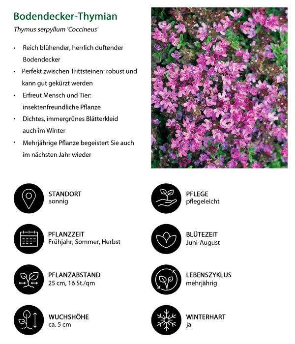 Das Staudenset Duftender Thymian hat eigentlich nur zwei Wünsche an Sie: einen sonnigen bis halbschattigen Standort in einem durchlässigen und gerne trockenen Boden. Erfüllen Sie den Pflanzen diese Wünsche, werden sie fast von allein viele Jahren Ihren Garten schmücken. Sie brauchen kein Wasser und keine Düngegaben und auch keinen Rückschnitt im Herbst. Und natürlich ist der pflegeleichte Bodendecker auch winterhart.