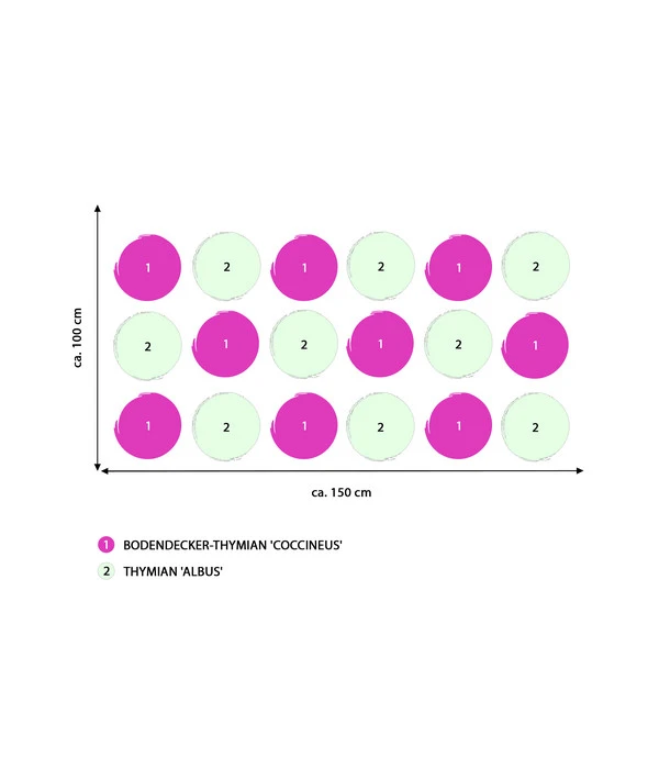 Die 18 Pflanzen im Staudenset Duftender Thymian sind wunderbar vielseitig einsetzbar: Sie können ein sonniges Steingartenbeet damit bepflanzen – im modernen Schachbrett-Muster wie in unserem Pflanzbeispiel oder als locker angeordnete größere Blüteninseln. Sie können das Staudenset Duftender Thymian aber auch teilen und jeweils mehrere Pflanzen als leuchtende Tuffs im klassischen Staudenbeet verteilen, Töpfe und Kästen damit schmücken oder Mauerkronen und Dächer damit begrünen. Manche Gärtner verwenden die tollen Bodendecker auch als unkomplizierten Rasenersatz, den man betreten kann, aber nicht mähen muss.