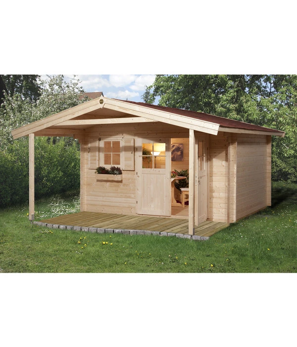 Wände 28 mm Blockbohlen, Dach und Boden 19 mm Massivholz