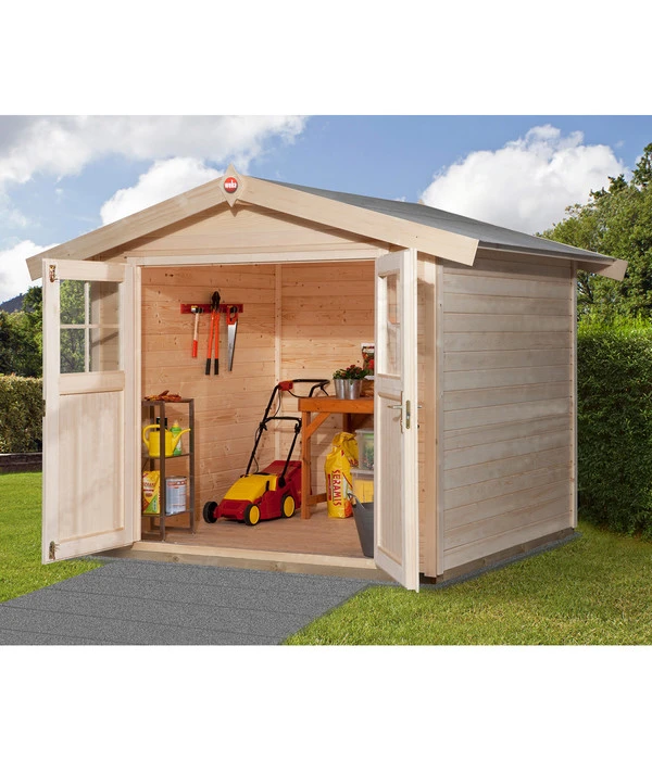 Neben der robusten Materialqualität begeistert Sie sicherlich die Rahmen-Doppeltür: Sie sorgt für mehr Licht und Sicherheit. Auch größere Maschinen können Sie so einfach hineinstellen. Zum Schutz vor unberechtigten Zugriffen trägt die Griffgarnitur mit Profizylinder und Ersatzschlüsseln bei. Teure Geräte und Werkzeuge sind deshalb im Satteldachhaus der Marke Weka bestens aufgehoben.