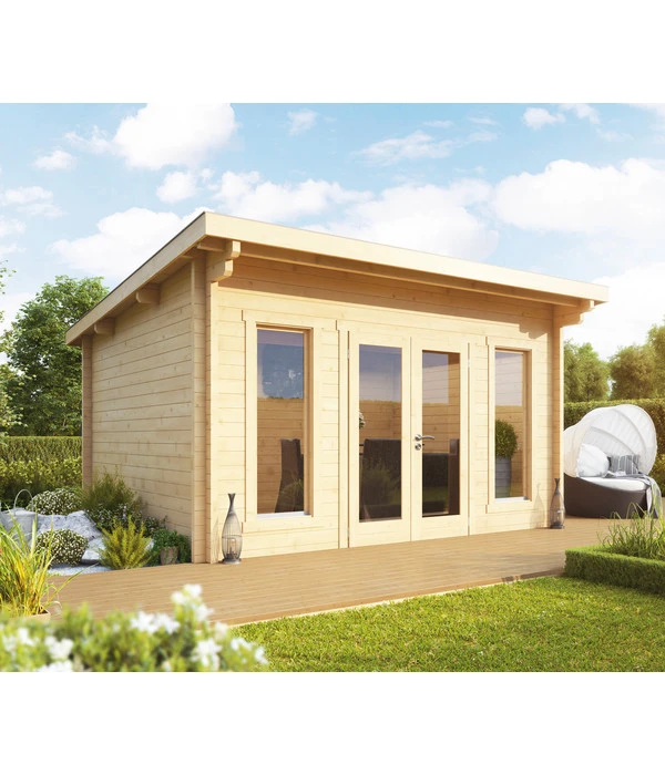 Die Wandbohlen bestehen beim Wolff Finnhaus Gartenhaus Trondheim 70-M aus naturbelassenem, Nordischem Nadelholz und sind für eine einfache Montage maßgenau gesägt, während eine spezielle Montageart die wind- und regendichte Verbindung in den Ecken gewährleistet. Ergänzt werden die Wände von 20 mm Dachbrettern und 28 mm Fußbodenbohlen. Da sich aufgrund der geringen Dachneigung keine Abdeckung mit klassischen Schindeln anbietet, empfehlen wir Ihnen, gleich die selbstklebende Dachbahn mit zu bestellen, um das Holzhaus sicher vor dem Eindringen von Feuchtigkeit zu schützen.
